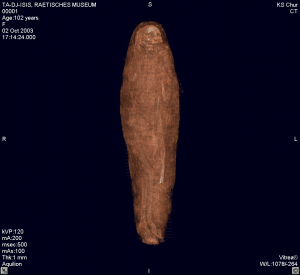 Diseases and other special characteristics: The mummy is in a bad condition and the skeleton is anatomically dislocated, preobably due to previous unwrapping or transport. Identified diseases: Benign tumour (Hemangioma) in the 4th lumbar vertebra, scoliosis.